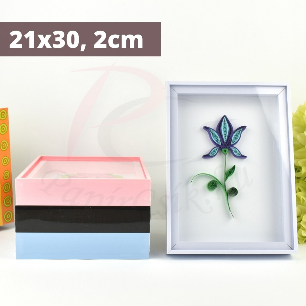 A quilling képkeret 2cm mély, így biztosak lehetünk benne, hogy alkotásunk elfér! A kerethez biztosítunk 240 grammos fehér háttérlapot is. A tetején termesztésen plexi található, így védi az alkotásunkat a portól. Tehetjük fektetve, vagy állítva az asztalra, de a falra is feltehetjük. Anyaga műanyag, belső mérete 21x30cm.